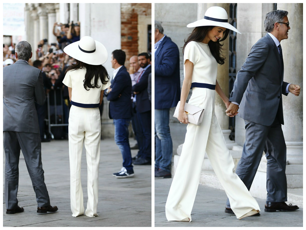Il look di Amal a Venezia per la firma ufficiale e la registrazione del matrimonio in Comune ha scelto un bellissimo completo blusa e pantaloni color crema firmati da Stella McCartney. Tocco da vera diva il cappello a tesa larga.