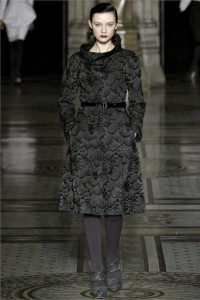 Mulberry punta al bon ton ma con un’incursione nel mondo rock – chic. Ogni mise è super accessoriata e caratterizzata dall’uso di tessuti pesanti. E’ un tripudio di pellicce, di capi anni ’50 ma molto contemporanei grazie a dettagli in contrasto. Must have sono le zip e le texture trapuntante o profilate in pelle. Le stampe richiamano quadri impressionisti. Per la sera via libera al pizzo mixato con la pelle per un look aggressiv e total black. I colori sono quelli dell’autunno e della terra; nero per la sera e rosso fuoco per gli accessori.