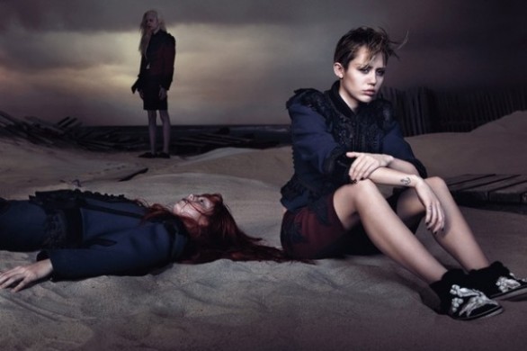 La cantante posa seduta su una spiaggia desolata assieme alla modella Natalie Westling ed un’altra bionda nello sfondo. Indossa uno degli outfits principali della sfilata: la giacca navy con ornamenti, shorts bordeaux e sneakers nere con fiori bianchi. Al contrario dei tagli corti a bob che si sono visti in passerella però, qui Miley e le modelle hanno capelli e make-up naturali.