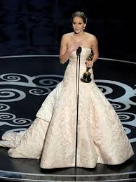 Jane Fonda indossa un lungo abito giallo firmato Atelier Versace. Scarpe e clutch di Jimmy Choo e gioielli Chopard. A 75 anni riesce sempre a stupire ma con eleganza. Anne Hathaway, miglior attrice non protagonista, ha scelto un abito di Prada in raso rosa con profonda scollatura sulla schiena che viene percorsa solo da qualche nastro. Collier in platino e diamanti della collezione Blue Book 2013 che scende sulla schiena e viene abbinato ad orecchini Lucida ed a bracciale con diamante firmato Tiffany. Jennifer Lawrence indossa un abito firmato Dior Haute Couture bianco perla che con le luci sfuma nel rosa e nel crema. Anche per lei collana sottile che scende sulla schiena.